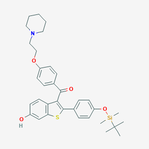 4'-tert-Butyldimethylsilyl-6-hydroxy Raloxifene (CAS: 174264-46-1) is a chemically modified derivative of the selective estrogen receptor modulator (SERM) Raloxifene. Its molecular formula is C₃₄H₄₁NO₄SSi, with a molecular weight of 587.85 g/mol . This compound is primarily used as a synthetic intermediate in the production of Raloxifene 6-glucuronide, a metabolite of Raloxifene that contributes to its pharmacokinetic profile . Its role is confined to pharmaceutical synthesis, where it serves to protect hydroxyl groups during chemical reactions, enhancing the stability and yield of target molecules .