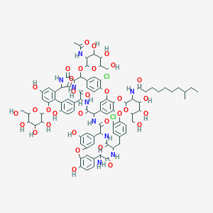 (1S,2R,19R,22R,34S,37R,40R,52S)-2-[(2R,3R,4R,5S,6R)-3-acetamido-4,5-dihydroxy-6-(hydroxymethyl)oxan-2-yl]oxy-22-amino-5,15-dichloro-64-[(2S,3R,4R,5S,6R)-4,5-dihydroxy-6-(hydroxymethyl)-3-(8-methyldecanoylamino)oxan-2-yl]oxy-26,31,44,49-tetrahydroxy-21,35,38,54,56,59-hexaoxo-47-[(2R,3S,4S,5S,6R)-3,4,5-trihydroxy-6-(hydroxymethyl)oxan-2-yl]oxy-7,13,28-trioxa-20,36,39,53,55,58-hexazaundecacyclo[38.14.2.23,6.214,17.219,34.18,12.123,27.129,33.141,45.010,37.046,51]hexahexaconta-3,5,8,10,12(64),14,16,23(61),24,26,29(60),30,32,41(57),42,44,46(51),47,49,62,65-henicosaene-52-carboxylic acid | |
