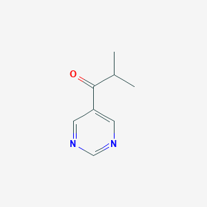 2-Methyl-1-(pyrimidin-5-yl)propan-1-one is a ketone derivative featuring a pyrimidine ring substituted at the 5-position. Pyrimidine, a six-membered aromatic heterocycle with two nitrogen atoms, confers distinct electronic and steric properties to the molecule.