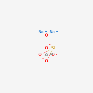 Sodium zirconium oxide silicate (Na₂ZrO(SiO₄)), CAS 12027-83-7, is a synthetic compound formed during the decomposition of zirconium silicate (ZrSiO₄) in alkaline environments. It is structurally distinct from naturally occurring ZrSiO₄ (zircon) and plays a critical role in industrial processes, such as the synthesis of zirconium chemicals and bioactive materials . Its formation typically involves the reaction of ZrSiO₄ with sodium hydroxide (NaOH) at elevated temperatures, yielding intermediates like Na₂ZrO(SiO₄), which can further decompose into sodium zirconate (Na₂ZrO₃) and sodium metasilicate (Na₂SiO₃) .