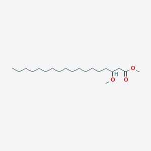 Methyl 3-methoxyoctadecanoate is a branched fatty acid methyl ester (FAME) characterized by an 18-carbon chain (octadecanoate) with a methoxy (-OCH₃) substituent at the third carbon position. This structural feature distinguishes it from linear or hydroxyl-substituted methyl esters. The methoxy group likely reduces polarity compared to hydroxylated analogs, influencing solubility, thermal stability, and reactivity.