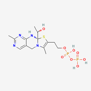 The synthesis of 2-{(9as)-9a-[(1s)-1-Hydroxyethyl]-2,7-Dimethyl-9a,10-Dihydro-5h-Pyrimido[4,5-D][1,3]Thiazolo[3,2-a]Pyrimidin-8-Yl}Ethyl Trihydrogen Diphosphate involves multiple steps, starting with the preparation of the pyrimido-thiazolo-pyrimidine core. This core is synthesized through a series of condensation reactions involving appropriate precursors under controlled conditions. The final step involves the phosphorylation of the ethyl group to form the trihydrogen diphosphate ester.