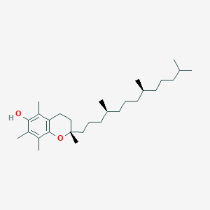 (-)-alpha-Tocopherol exerts its effects primarily through its antioxidant activity. It scavenges free radicals and reactive oxygen species, thereby preventing lipid peroxidation and protecting cell membranes. The molecular targets include lipid radicals and peroxyl radicals, which are neutralized by the donation of a hydrogen atom from the hydroxyl group of this compound. This process is facilitated by the regeneration of this compound from its oxidized form by other antioxidants such as Vitamin C.