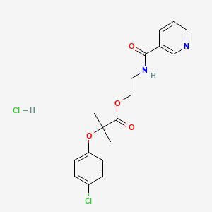 2-[(3-PYRIDYLCARBONYL)AMINO]ETHYL 2-(4-CHLOROPHENOXY)-2-METHYLPROPIONATE HYDROCHLORIDE is a complex organic compound with potential applications in various fields such as chemistry, biology, and medicine. This compound is characterized by its unique structure, which includes a pyridylcarbonyl group, a chlorophenoxy group, and a methylpropionate moiety.