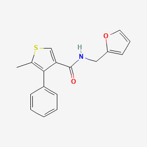 The synthesis of N-[(FURAN-2-YL)METHYL]-5-METHYL-4-PHENYLTHIOPHENE-3-CARBOXAMIDE typically involves multi-step organic reactions. One common method involves the condensation of 2-furanylmethylamine with 5-methyl-4-phenyl-3-thiophenecarboxylic acid under acidic conditions to form the desired amide bond. The reaction is usually carried out in the presence of a coupling agent such as EDCI (1-ethyl-3-(3-dimethylaminopropyl)carbodiimide) and a catalyst like DMAP (4-dimethylaminopyridine) to enhance the reaction efficiency .