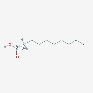 Nuclear Magnetic Resonance (NMR) Spectroscopy : While MS confirms the mass, ¹³C NMR spectroscopy confirms the precise location of the labels. The ¹³C NMR spectrum of (1,2-¹³C₂)decanoic acid will show two signals with significantly enhanced intensity corresponding to the carboxyl carbon (C-1) and the alpha-carbon (C-2). Definitive proof of the 1,2-labeling pattern comes from the observation of ¹³C-¹³C coupling (a splitting of the signals) between these two adjacent labeled carbons.