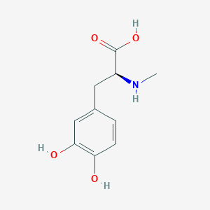 N-Methyl-L-DOPA is a synthetic derivative of L-3,4-dihydroxyphenylalanine (L-DOPA), a precursor to dopamine and a cornerstone in Parkinson’s disease therapy. Structurally, this compound features a methyl group (-CH₃) attached to the amino group of L-DOPA. This modification alters its pharmacokinetic and pharmacodynamic properties, including blood-brain barrier (BBB) permeability, metabolic stability, and receptor interactions. While L-DOPA itself is rapidly decarboxylated peripherally, necessitating co-administration with decarboxylase inhibitors, N-methylation may influence its enzymatic degradation and transport efficiency .