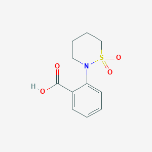 2-(1,1-Dioxido-1,2-thiazinan-2-yl)benzoic acid emerged as a compound of interest in the late 20th century during explorations into sulfonamide-based heterocycles. Its synthesis was first documented in the context of developing kinase inhibitors, with early reports appearing in patent literature and specialized chemical databases by the early 2000s. The compound gained prominence due to its structural similarity to bioactive thiazinane derivatives, which were being investigated for applications in medicinal chemistry. Key milestones include its inclusion in the ChemSpider database (ID: 21266068) and subsequent studies elucidating its role in enzyme inhibition.