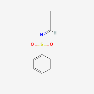 The compound is typically prepared by a condensation reaction between 4-methylbenzenesulfonamide and pivaldehyde (2,2-dimethylpropanal). This reaction involves the formation of an imine (Schiff base) linkage between the sulfonamide nitrogen and the aldehyde carbonyl group, resulting in the (E)-configured imine product.