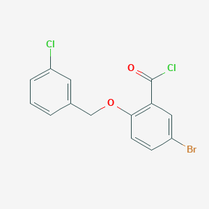 5-Bromo-2-[(3-chlorobenzyl)oxy]benzoyl chloride (C₁₄H₉BrCl₂O₂) is a halogenated benzoyl chloride derivative with a molecular weight of 360.03 g/mol. Its structure features a bromine atom at the 5-position of the benzoyl ring and a 3-chlorobenzyl ether group at the 2-position (Figure 1). This compound is identified by CAS 1160250-17-8 and ChemSpider ID 23079380 . It serves as a key intermediate in organic synthesis, particularly in the preparation of sulfonamides, β-lactamase inhibitors, and other bioactive molecules .