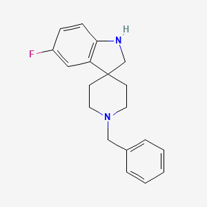 The mechanism of action of 1’-Benzyl-5-fluorospiro[indoline-3,4’-piperidine] involves its interaction with various molecular targets and pathways. The compound’s unique structure allows it to bind with high affinity to multiple receptors and enzymes, influencing biological processes. For example, it may inhibit specific enzymes or modulate receptor activity, leading to its observed biological effects .