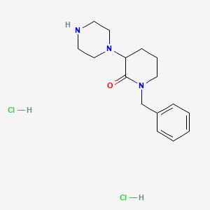 1-Benzyl-3-(piperazin-1-yl)piperidin-2-one dihydrochloride is a synthetic organic compound featuring a piperidin-2-one core substituted with a benzyl group at the 1-position and a piperazine moiety at the 3-position. The dihydrochloride salt form enhances its solubility and stability, making it suitable for pharmacological and biochemical studies.