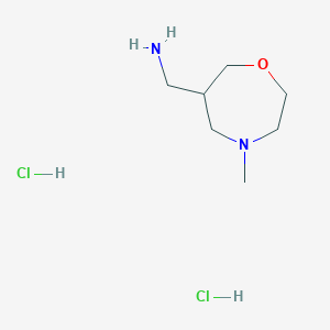 [(4-Methyl-1,4-oxazepan-6-yl)methyl]amine dihydrochloride (CAS: 1609400-87-4) is a bicyclic amine hydrochloride salt with the molecular formula C₇H₁₈Cl₂N₂O and a molecular weight of 217.14 g/mol . It features a seven-membered 1,4-oxazepane ring substituted with a methyl group at the 4-position and an aminomethyl group at the 6-position. The dihydrochloride salt form enhances its solubility in polar solvents, making it a practical intermediate in synthetic chemistry.