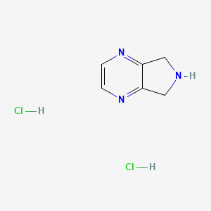 The synthesis of 6,7-Dihydro-5H-pyrrolo[3,4-b]pyrazine dihydrochloride involves several steps. One common method includes the cyclization of pyrrole with acyl (bromo)acetylenes to form 2-(acylethynyl)pyrroles. This is followed by the addition of propargylamine to the acetylenes, resulting in N-propargylenaminones. Finally, intramolecular cyclization catalyzed by cesium carbonate in dimethyl sulfoxide yields the desired pyrrolopyrazine derivative . Industrial production methods may vary, but they generally follow similar synthetic routes with optimizations for scale and efficiency.