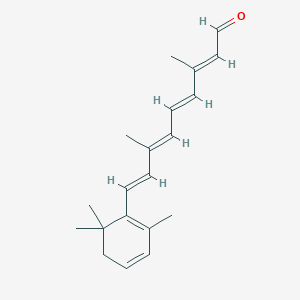 this compound (C20H28O) is a derivative of retinaldehyde (vitamin A1 aldehyde) with an additional double bond in its β-ionone ring, altering its photochemical properties and metabolic interactions . To study these differences, researchers should employ comparative spectroscopic analysis (UV-Vis absorption at ~380 nm for this compound vs. ~370 nm for retinaldehyde) and enzymatic assays (e.g., retinol dehydrogenase activity). Experimental designs must account for isomer-specific reactivity, particularly in retinoid-binding protein interactions .