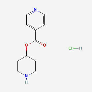 4-Piperidinyl isonicotinate hydrochloride (CAS: 1220020-07-4) is a piperidine-based compound featuring an ester linkage between the 4-piperidinyl group and isonicotinic acid (pyridine-4-carboxylic acid). Structurally, the compound combines a piperidine ring (a six-membered amine heterocycle) with a pyridine moiety via an ester bond. This design confers unique physicochemical properties, such as moderate polarity and basicity, which may influence its pharmacokinetic behavior and receptor interactions.