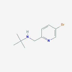 The compound (5-bromopyridin-2-yl)methylamine is a secondary amine featuring a pyridine core substituted with a bromine atom at the 5-position and a methyl group at the 2-position, which is further bonded to a tert-butylamine moiety. According to IUPAC rules, the parent structure is pyridine, with substituents prioritized based on functional group hierarchy and positional numbering. The systematic name is N-(tert-butyl)-1-(5-bromopyridin-2-yl)methanamine , reflecting the tert-butyl group attached to the nitrogen atom of the methylamine side chain.
