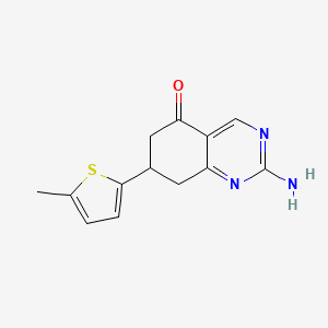 2-Amino-7-(5-methyl-2-thienyl)-7,8-dihydroquinazolin-5(6H)-one is a quinazolinone derivative featuring a 5-methylthiophene substituent at the 7-position and an amino group at the 2-position. Quinazolinones are heterocyclic compounds with a bicyclic structure containing two nitrogen atoms, widely studied for their biological activities, including kinase inhibition, MAO (monoamine oxidase) modulation, and anticancer properties . This compound is part of a broader class of 7,8-dihydroquinazolin-5(6H)-ones, where substitutions at the 2- and 7-positions significantly influence physicochemical and pharmacological profiles.