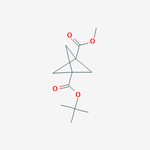 Bicyclo[1.1.1]pentane-1,3-dicarboxylic acid, tert-butyl methyl ester (C12H18O4) is a highly strained bicyclic compound featuring a rigid, non-planar scaffold. This derivative of bicyclo[1.1.1]pentane-1,3-dicarboxylic acid (BCP) is characterized by a tert-butyl ester at one carboxyl group and a methyl ester at the other. Its synthesis typically involves photochemical [2+2] cycloaddition of propellane with diacetyl under 365 nm UV light, followed by sequential esterification and protection steps . The tert-butyl group enhances steric protection and lipophilicity, making it valuable in medicinal chemistry for bioisosteric replacement of aromatic rings or tert-butyl groups in drug candidates .