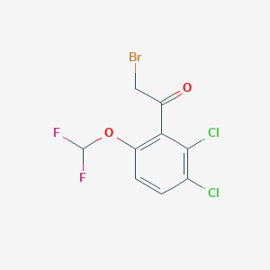 2',3'-Dichloro-6'-(difluoromethoxy)phenacyl bromide is a halogenated phenacyl bromide derivative characterized by a dichloro-substituted aromatic ring, a difluoromethoxy group at the 6'-position, and a brominated phenacyl moiety. This compound is primarily utilized in organic synthesis as an alkylating agent or electrophile due to the reactivity of the bromide group. Its structural features, including electron-withdrawing substituents (Cl and OCF₂H), enhance its stability and reactivity in nucleophilic substitution reactions, making it valuable in constructing complex heterocyclic frameworks or functionalized aromatic systems .