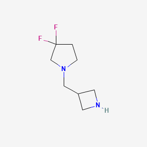 1-[(Azetidin-3-yl)methyl]-3,3-difluoropyrrolidine is a heterocyclic compound featuring azetidine and pyrrolidine rings, noted for its potential therapeutic applications in medicinal chemistry. The presence of fluorine atoms enhances its chemical stability and biological activity, making it a subject of interest in pharmacological studies.