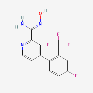 4-(4-Fluoro-2-trifluoromethylphenyl)-N-hydroxypyridine-2-carboxamidine is a synthetic small molecule characterized by a pyridine backbone substituted with a hydroxypyridine carboxamidine group and a 4-fluoro-2-trifluoromethylphenyl moiety. This structure confers unique electronic and steric properties, making it a candidate for therapeutic applications, particularly in enzyme inhibition due to the amidine group’s basicity. The compound’s design leverages fluorine and trifluoromethyl substituents to enhance metabolic stability and binding affinity .