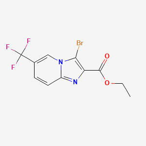 Ethyl 3-bromo-6-(trifluoromethyl)imidazo[1,2-a]pyridine-2-carboxylate is a halogenated imidazo[1,2-a]pyridine derivative with significant utility in medicinal chemistry and organic synthesis. Its molecular formula is C₁₁H₈BrF₃N₂O₂, and it has a molecular weight of 337.1 g/mol . The compound features a bromine atom at position 3 and a trifluoromethyl (-CF₃) group at position 6 on the imidazo[1,2-a]pyridine scaffold, which is esterified at position 2 with an ethyl group.