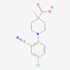 1-(4-Chloro-2-cyanophenyl)-4-methylpiperidine-4-carboxylic acid is a synthetic organic compound belonging to the piperidine class, characterized by its unique chemical structure that includes a chloro and a cyano group on the phenyl ring. Its molecular formula is C13H14ClN3O2, with a molecular weight of approximately 281.72 g/mol. This compound has garnered attention for its potential biological activities, particularly in the fields of pharmacology and medicinal chemistry.