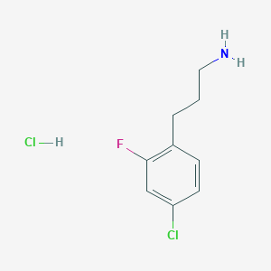 3-(4-Chloro-2-fluorophenyl)propan-1-amine hydrochloride is a compound of interest in medicinal chemistry due to its unique structural features, including a primary amine and a halogenated aromatic ring. This compound has been investigated for its potential biological activities, particularly in relation to receptor binding and enzyme inhibition.