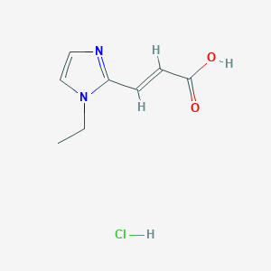 The mechanism of action of 3-(1-ethyl-1H-imidazol-2-yl)prop-2-enoic acid hydrochloride involves its interaction with specific molecular targets. The imidazole ring can bind to metal ions, enzymes, or receptors, modulating their activity. The propenoic acid moiety can participate in hydrogen bonding and electrostatic interactions, enhancing the compound’s binding affinity and specificity.