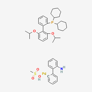 Methanesulfonato(2-dicyclohexylphosphino-2’,6’-di-i-propoxy-1,1’-biphenyl)(2’-amino-1,1’-biphenyl-2-yl)palladium(II) exhibits specific subcellular localization patterns. It can be targeted to various cellular compartments, including the cytoplasm, nucleus, and mitochondria. The compound’s localization is influenced by targeting signals and post-translational modifications that direct it to specific organelles. For example, it can be directed to the nucleus by nuclear localization signals, where it can interact with transcription factors and chromatin-modifying enzymes. In the mitochondria, it can influence mitochondrial function by interacting with mitochondrial enzymes and proteins.