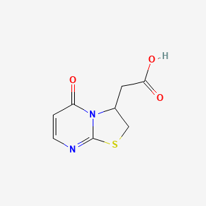 (5-Oxo-2,3-dihydro-5H-[1,3]thiazolo[3,2-a]pyrimidin-3-yl)acetic acid (molecular formula: C₈H₈N₂O₃S; molecular weight: 212.22 g/mol) is a bicyclic heterocyclic compound featuring a fused thiazole-pyrimidine core with an acetic acid substituent at the 3-position. Its IUPAC name reflects the oxo group at position 5 and the dihydro nature of the thiazolo-pyrimidine ring system. This compound is synthesized via cyclocondensation reactions, often involving bromoacetyl intermediates and thioureas in acetic acid . Its structural simplicity and functional groups make it a precursor for diverse applications, including pharmaceuticals and materials science.