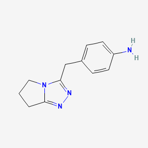 4-{5H,6H,7H-Pyrrolo[2,1-c][1,2,4]triazol-3-ylmethyl}aniline is a heterocyclic amine featuring a fused pyrrolotriazole core linked to an aniline group via a methylene bridge. Its synthesis typically involves multi-step reactions, including cyclocondensation and functional group modifications, as inferred from analogous procedures in related triazole derivatives . The compound is noted for its high reactivity and stringent safety requirements, including precautions against flammability, toxicity, and environmental hazards .