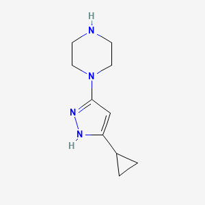 1-(3-cyclopropyl-1H-pyrazol-5-yl)piperazine plays a significant role in various biochemical reactions. It interacts with several enzymes, proteins, and other biomolecules, influencing their activity and function. For instance, this compound has been shown to interact with dipeptidyl peptidase 4, an enzyme involved in glucose metabolism and regulation. The nature of these interactions often involves binding to the active site of the enzyme, leading to inhibition or modulation of its activity. Additionally, this compound may interact with other proteins involved in cellular signaling pathways, further influencing biochemical processes.