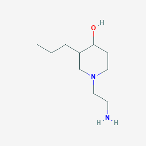 1-(2-Aminoethyl)-3-propylpiperidin-4-ol (CAS: 2097995-33-8) is a piperidine derivative featuring an aminoethyl group at position 1 and a propyl group at position 3 of the piperidin-4-ol scaffold. The aminoethyl group enhances water solubility and hydrogen-bonding capacity, while the propyl substituent contributes to lipophilicity, influencing membrane permeability and target interactions.