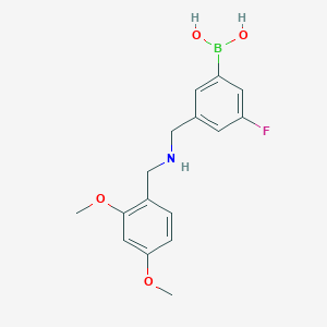 (3-(((2,4-Dimethoxybenzyl)amino)methyl)-5-fluorophenyl)boronic acid plays a crucial role in biochemical reactions, particularly in the context of enzyme inhibition and interaction with proteins. This compound is known to interact with serine proteases, forming a reversible covalent bond with the active site serine residue. This interaction inhibits the enzyme’s activity, making this compound a valuable tool in studying protease functions and developing protease inhibitors.