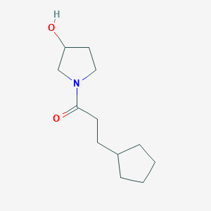 3-Cyclopentyl-1-(3-hydroxypyrrolidin-1-yl)propan-1-one is a chemical compound with the molecular formula C₁₂H₂₁NO₂ and a molecular weight of 211.3 g/mol. This compound is characterized by its cyclopentyl group attached to a propanone structure, which is further substituted with a 3-hydroxypyrrolidin-1-yl group