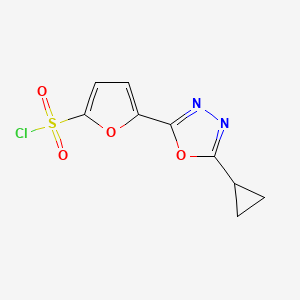 The mechanism of action of 5-(5-Cyclopropyl-1,3,4-oxadiazol-2-yl)-2-furansulfonyl chloride depends on its application. In medicinal chemistry, it may interact with biological targets such as enzymes or receptors, modulating their activity. The sulfonyl chloride group can form covalent bonds with nucleophilic sites on proteins, potentially leading to inhibition or activation of biological pathways.