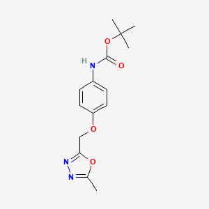 The IUPAC name for this compound is tert-butyl N-[4-[(5-methyl-1,3,4-oxadiazol-2-yl)methoxy]phenyl]carbamate. Its molecular formula is C15H19N3O4, and it has a molecular weight of approximately 305.33 g/mol. The compound exhibits moderate solubility in organic solvents and is typically stored at room temperature.
