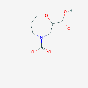 4-(tert-Butoxycarbonyl)-1,4-oxazepane-2-carboxylic acid is a seven-membered heterocyclic compound featuring a 1,4-oxazepane backbone, a tert-butoxycarbonyl (Boc) protecting group at the 4-position, and a carboxylic acid group at the 2-position. Its molecular formula is C₁₁H₁₉NO₅, with a molecular weight of 245.27 g/mol . The compound is commonly utilized in pharmaceutical research as a chiral building block for drug synthesis, particularly in the development of protease inhibitors and peptidomimetics. Key properties include: