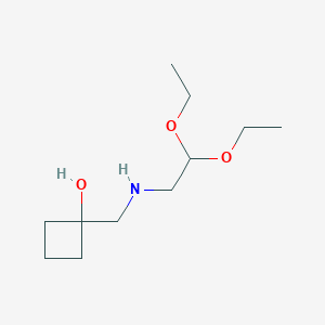 1-{[(2,2-Diethoxyethyl)amino]methyl}cyclobutan-1-ol is a cyclobutanol derivative featuring a substituted aminomethyl group at the 1-position of the cyclobutane ring. This compound’s unique structure makes it relevant for applications in medicinal chemistry and organic synthesis, particularly in studies involving strained ring systems or functionalized amines.