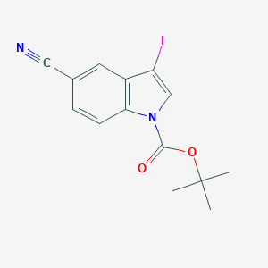 The molecular formula of tert-butyl 5-cyano-3-iodo-1H-indole-1-carboxylate is C₁₄H₁₃I N₂O₂, with a molecular weight of approximately 368.17 g/mol. The compound features an indole core with a tert-butyl group, a cyano group at the 5th position, and an iodine atom at the 3rd position, which enhances its reactivity and biological properties .
