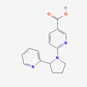 Structural validation is confirmed via spectroscopic and computational methods. The molecular formula C₁₅H₁₅N₃O₂ (molecular weight: 269.30 g/mol) aligns with the hybrid pyridine-pyrrolidine architecture. The SMILES notation OC(=O)c1ccc(nc1)N2CCCC2c3ccccn3 explicitly defines the connectivity: the carboxylic acid group (-COOH) at position 3 of the first pyridine ring, the pyrrolidine nitrogen at position 1 linked to position 6 of the parent pyridine, and the second pyridine ring attached to position 2 of the pyrrolidine.