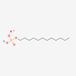 this compound is synthesized via esterification of dodecyl alcohol with phosphorus pentoxide (P₂O₅), followed by hydrolysis and neutralization with potassium hydroxide (KOH). Key steps include maintaining a reaction temperature of 70°C for 4 hours and controlling pH during neutralization. Purity can be validated using Fourier-transform infrared spectroscopy (FTIR) to confirm ester bonds and titration to quantify residual acidity. Chromatographic methods (e.g., HPLC) may further assess impurities .