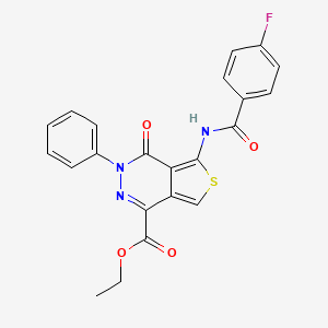 Ethyl 5-(4-fluorobenzamido)-4-oxo-3-phenyl-3H,4H-thieno[3,4-d]pyridazine-1-carboxylate is a heterocyclic compound featuring a thienopyridazine core substituted with a 4-fluorobenzamido group at position 5, a phenyl group at position 3, and an ethyl carboxylate ester at position 1. This structure combines electron-withdrawing (fluorine, carbonyl) and aromatic (phenyl, thiophene) moieties, making it a candidate for pharmacological studies, particularly in tau aggregation inhibition (as suggested by analogs in ). Its molecular formula is C22H16FN3O4S, with an average molecular weight of 437.445 g/mol .