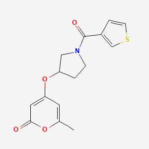 6-methyl-4-((1-(thiophene-3-carbonyl)pyrrolidin-3-yl)oxy)-2H-pyran-2-one is a synthetic organic compound characterized by a pyranone core structure with a unique thiophene-carbonyl-pyrrolidine moiety. This compound has garnered interest in medicinal chemistry due to its potential biological activities, which include antimicrobial, anticancer, and anti-inflammatory properties.