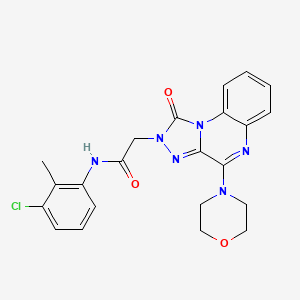 This compound features a triazolo[4,3-a]quinoxaline core fused with a 1-oxo group and a morpholino substituent at position 2. The acetamide side chain is linked to a 3-chloro-2-methylphenyl group, which contributes to its unique physicochemical and pharmacological profile. The morpholino group enhances solubility, while the chloro-methylphenyl moiety may influence target binding affinity and metabolic stability .
