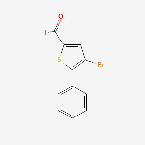 Simultaneously, the bromo substituent at the 4-position of the thiophene ring provides a site for metal-catalyzed cross-coupling reactions. This allows for the introduction of various aryl, alkyl, or alkynyl groups, leading to the construction of highly substituted and complex thiophene-based structures. The phenyl group at the 5-position also influences the electronic properties and steric environment of the molecule, which can be leveraged in designing target compounds with specific characteristics. The synthesis of this compound can be achieved through the bromination of 5-phenylthiophene-2-carbaldehyde (B91291).