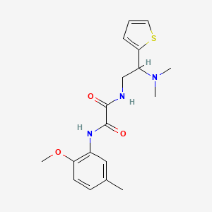 This compound is a substituted oxalamide featuring a thiophen-2-yl group and a 2-methoxy-5-methylphenyl moiety linked via a dimethylaminoethyl chain. The oxalamide core is known for its metabolic stability and hydrogen-bonding capacity, which may enhance target binding .