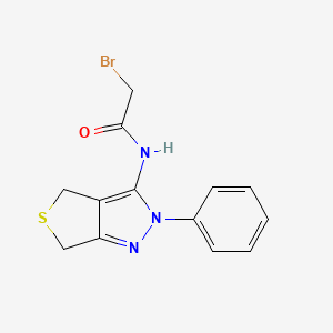 The mechanism of action of 2-bromo-N-(2-phenyl-4,6-dihydrothieno[3,4-c]pyrazol-3-yl)acetamide involves its interaction with specific molecular targets. The compound’s structure allows it to bind to certain enzymes or receptors, potentially inhibiting or activating their function. The exact pathways involved depend on the specific application and target being studied.